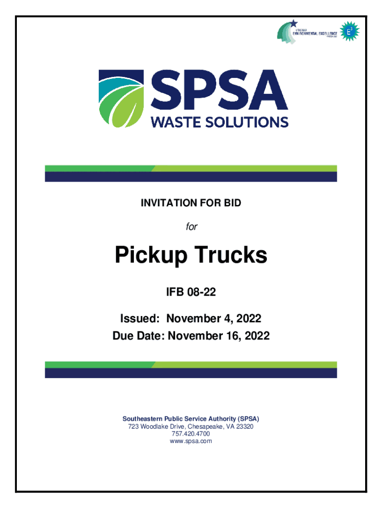 INVITATION FOR BID pickup Trucks IF 0822 Issued: November 4, 2022, Due Date: November 16, 2022Southeastern Public Service Authority (SPA) 723 Wood lake Drive, Chesapeake, VA 23320 757.420.4700 www.spsa.comTABLE