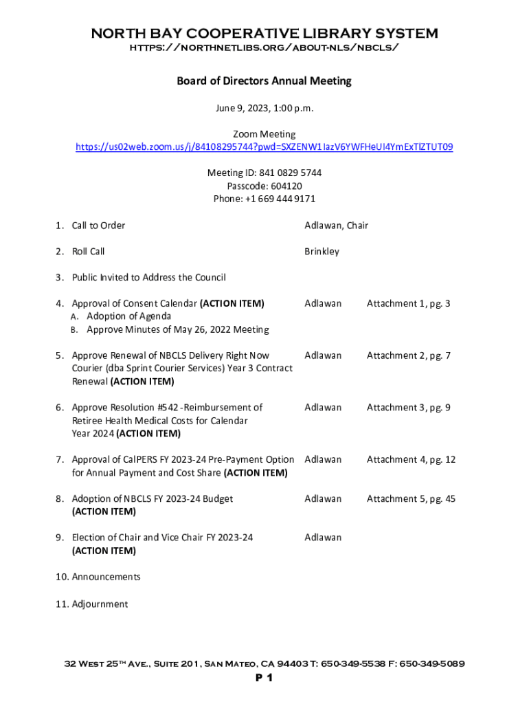 NORTH BAY COOPERATIVE LIBRARY SYSTEM https://northnetlibs.org/aboutnls/nbcls/Board of Directors Annual Meeting June 9, 2023, 1:00 p.m. Zoom Meeting https://us02web.zoom.us/j/84108295744?pwdSXZENW1IazV6YWFHeUI4YmExTlZTUT09