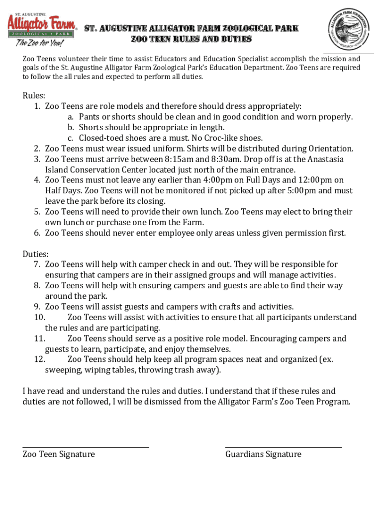 St. Augustine Alligator Farm Zoological Park Zoo Teen Rules and Duties Zoo Teens volunteer their time to assist Educators and Education Specialist accomplish the mission and goals of the St. Augustine