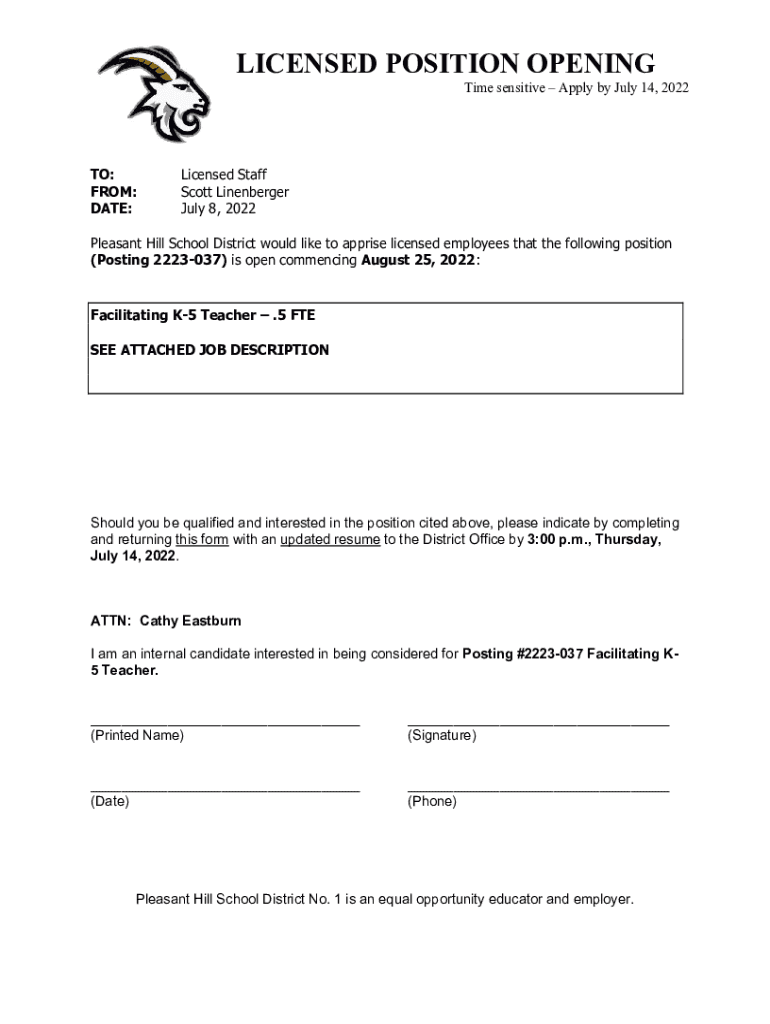 July 8, 2022Pleasant Hill School District would like to apprise licensed employees that