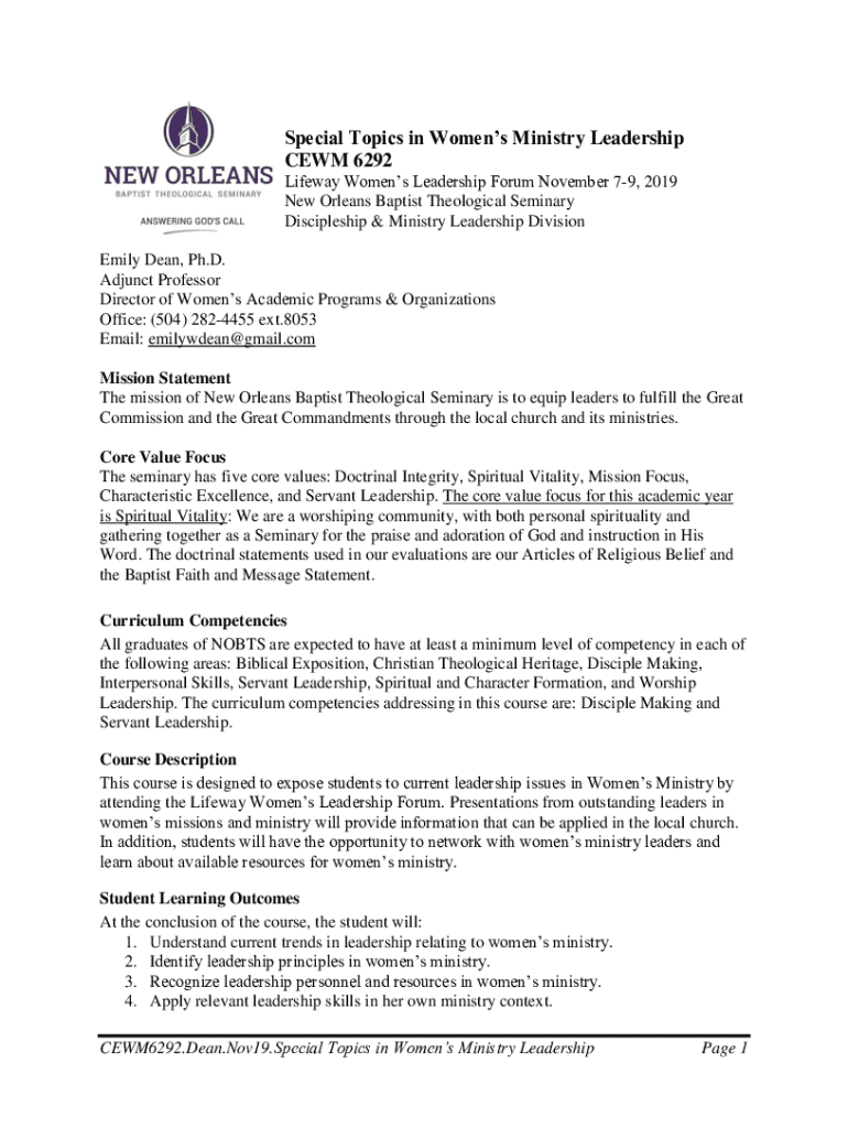 Special Topics in Women's Ministry Leadership CEM 6292 Lifeway Women's Leadership Forum November 79, 2019 New Orleans Baptist Theological Seminary Discipleship & Ministry Leadership Division Emily