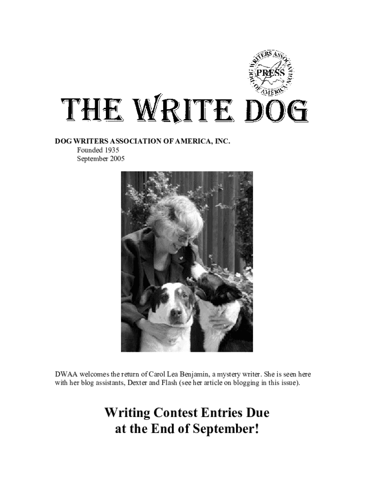 DOG WRITERS ASSOCIATION OF AMERICA, INC. Founded 1935 September 2005DWAA welcomes the return of Carol Lea Benjamin, a mystery writer. She is seen here with her blog assistants, Dexter and Flash (see