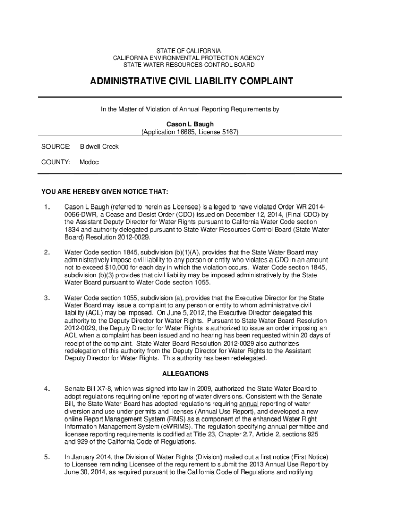STATE WATER RESOURCES CONTROL BOARDADMINISTRATIVE CIVIL LIABILITY COMPLAINT