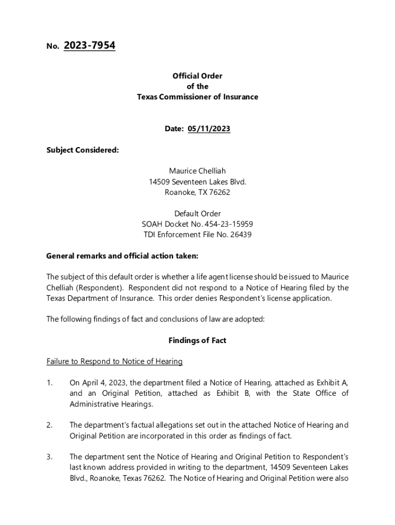 No.20237954 Official Order of the Texas Commissioner of Insurance Date: 05/11/2023Subject Considered: Maurice Hellish 14509 Seventeen Lakes Blvd. Roanoke, TX 76262 Default Order SOAP Docket No. 4542315959