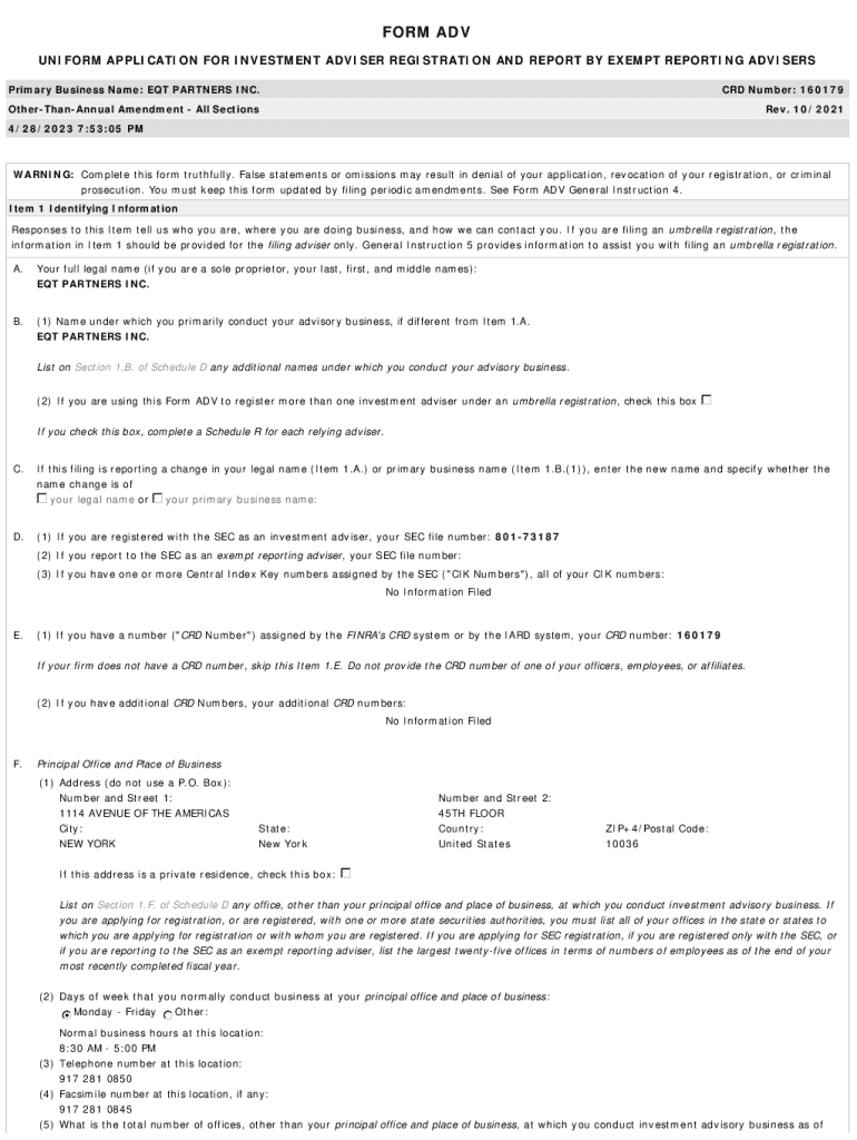 Get the free Primary Business Name: EQT PARTNERS INC