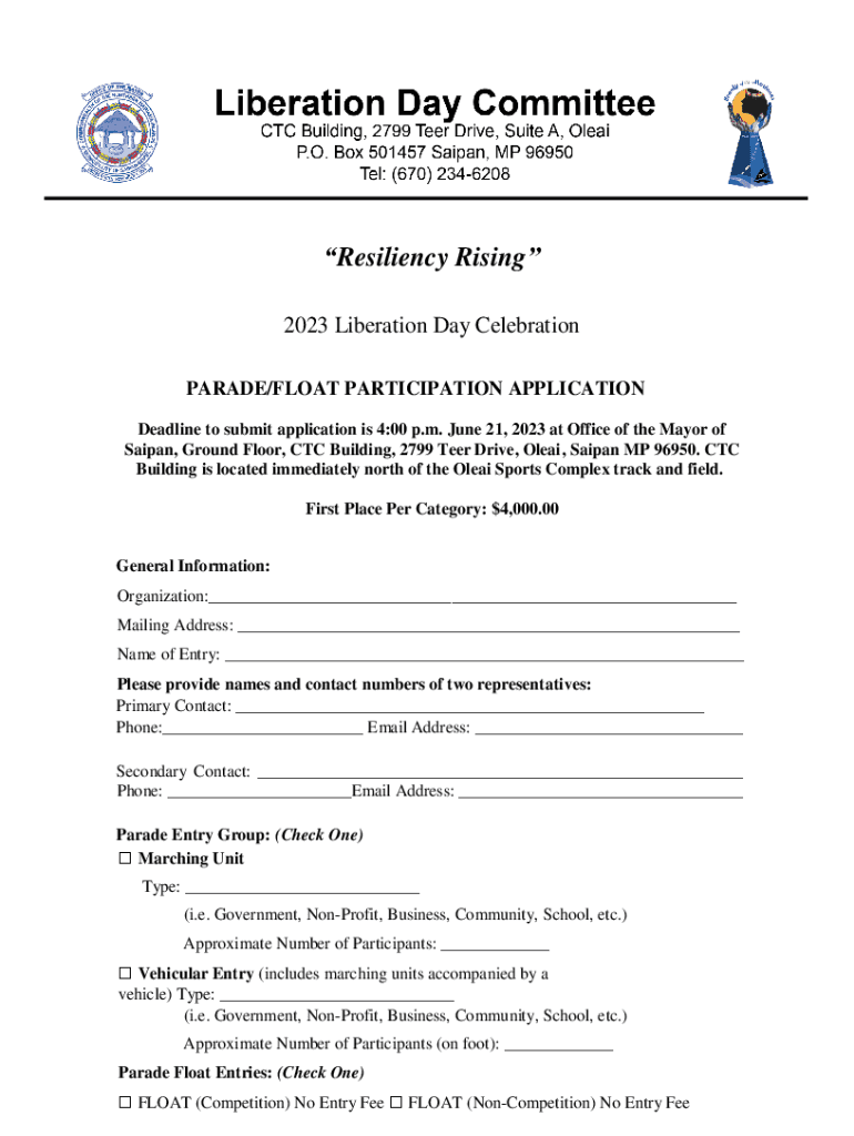 Resiliency Rising 2023 Liberation Day Celebration PARADE/FLOAT PARTICIPATION APPLICATION Deadline to submit application is 4:00 p.m. June 21, 2023, at Office of the Mayor of Sampan, First Floor, CTC