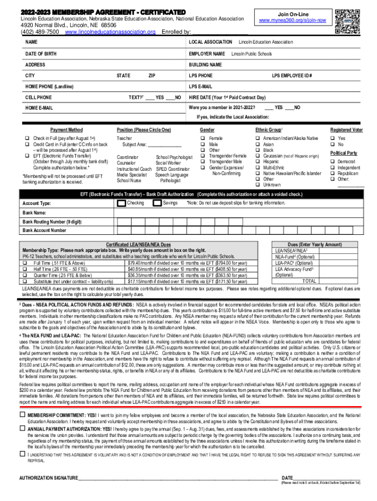 You can fill out the Lincoln Education Association/NSEA form online or by mail, providing the necessary information and your dues payment.