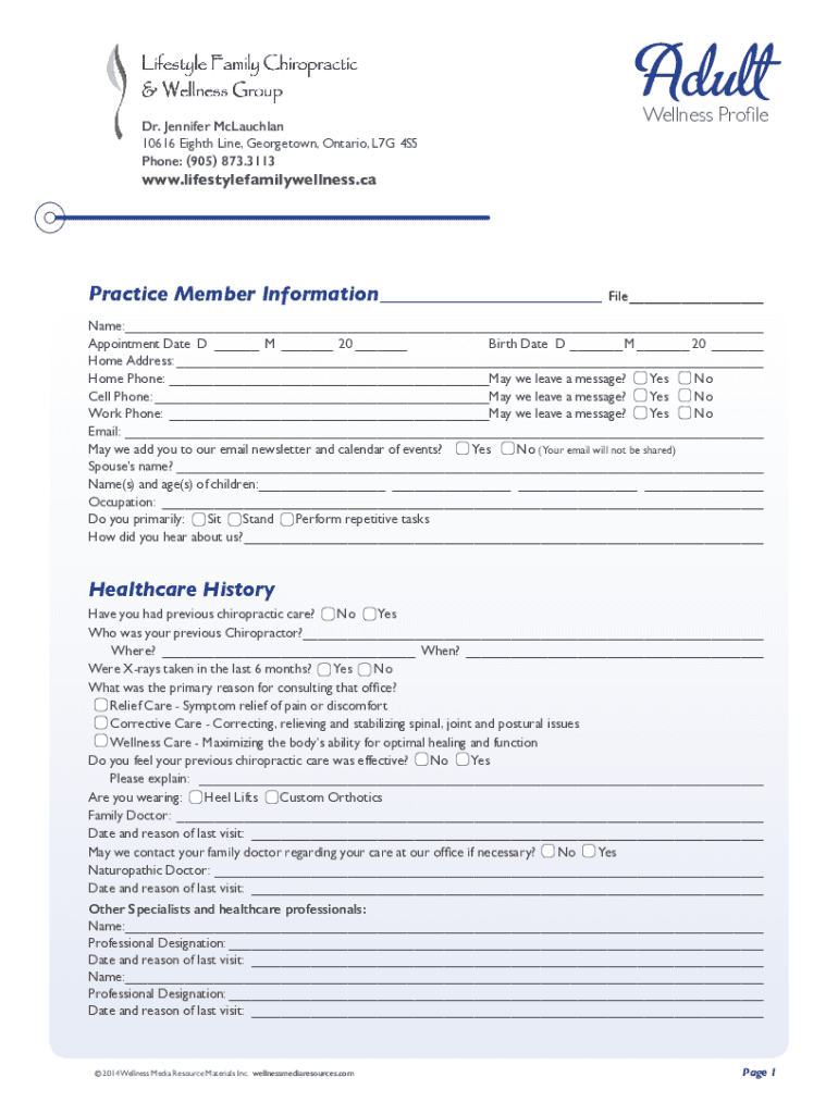 Dr. Jennifer McLaughlin 10616 Eighth Line, Georgetown, Ontario, L7G 4S5 Phone: (905) 873.3113AdultWellness Profile.lifestylefamilywellness.practice Member Information___File___Name:___ Appointment