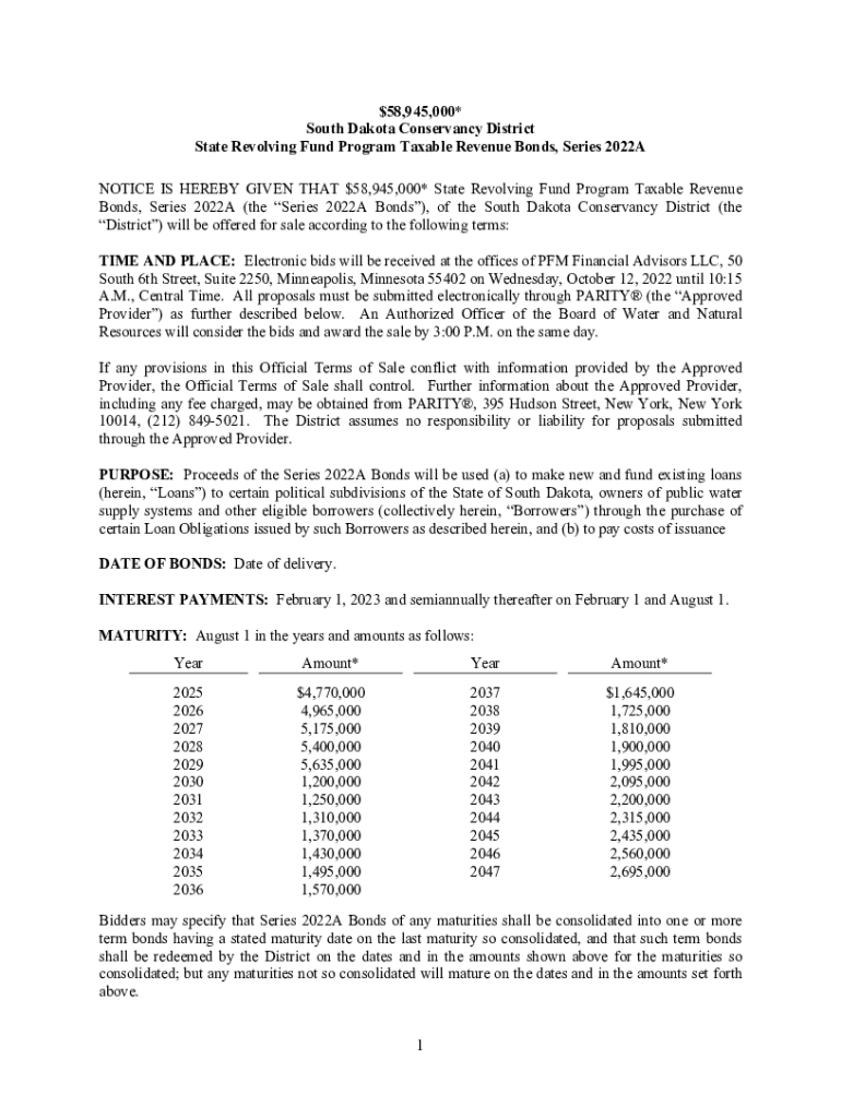 $58,945,000* South Dakota Conservancy District State Revolving Fund Program Taxable Revenue Bonds, Series 2022A NOTICE IS HEREBY GIVEN THAT $58,945,000* State Revolving Fund Program Taxable Revenue