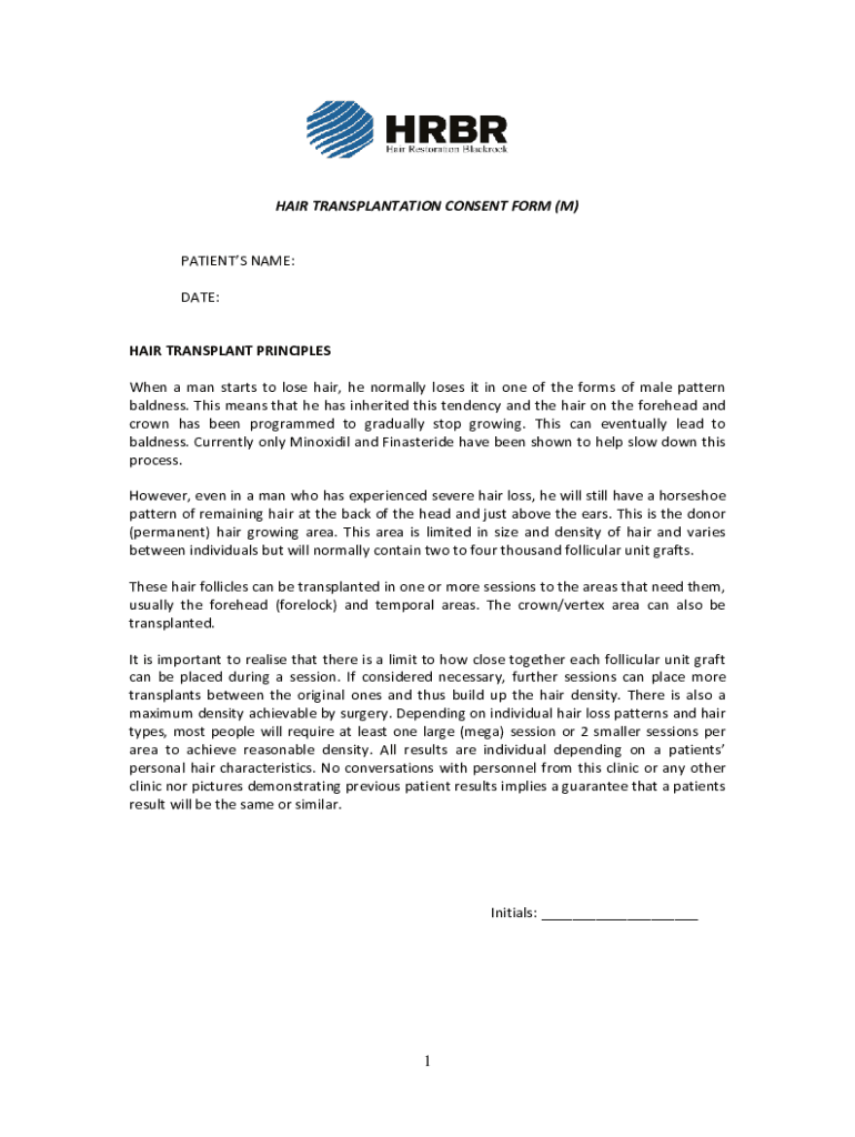 HAIR TRANSPLANTATION CONSENT FORM (M) PATIENTS NAME: DATE: HAIR TRANSPLANT PRINCIPLES When a man starts to lose hair, he normally loses it in one of the forms of male pattern baldness. This means