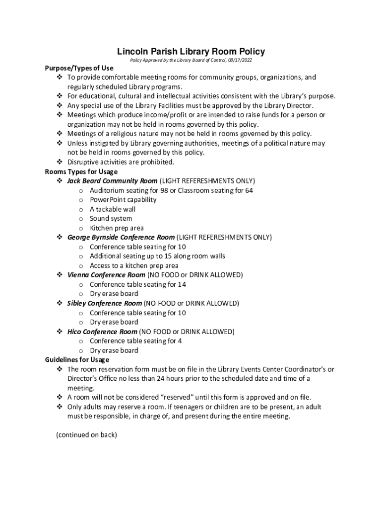 Lincoln Parish Library Room Policy Approved by the Library Board of Control, 08/17/2022Purpose/Types of Used to provide comfortable meeting rooms for community groups, organizations, and regularly