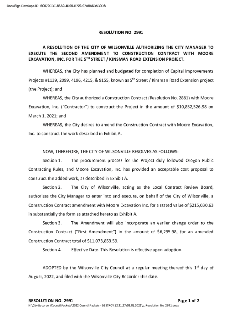 RESOLUTION NO. 2991 A RESOLUTION OF THE CITY OF WILSONVILLE AUTHORIZING THE CITY MANAGER TO EXECUTE THE SECOND AMENDMENT TO CONSTRUCTION CONTRACT WITH MOORE EXCAVATION, INC. FOR THE 5TH STREET / KINSMAN
