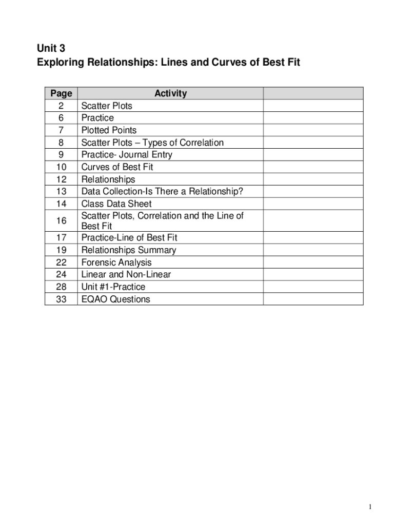 Unit 3 Exploring Relationships: Lines and Curves of Best Fit Page 2 6 7 8 9 10 12 13 14 16 17 19 22 24 28 33Activity Scatter Plots Practice Plotted Points Scatter Plots Types of Correlation Practice