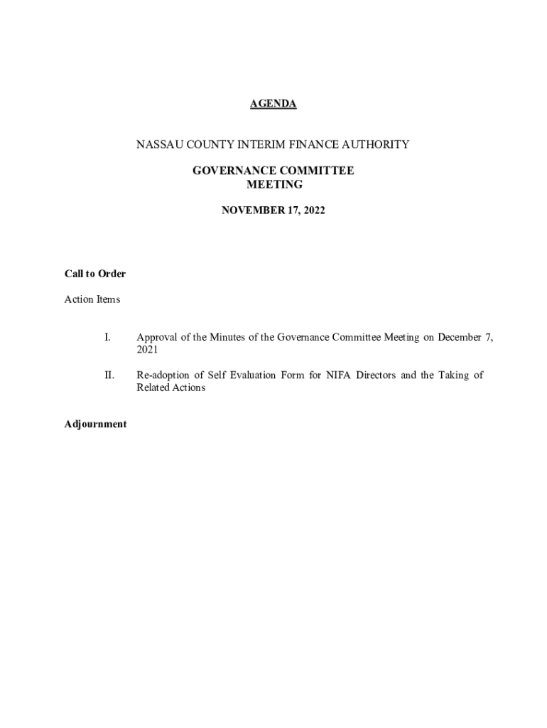 AGENDANASSAU COUNTY INTERIM FINANCE AUTHORITY GOVERNANCE COMMITTEE MEETING NOVEMBER 17, 2022Call to Order Action Items I. Approval of the Minutes of the Governance Committee Meeting on December 7,