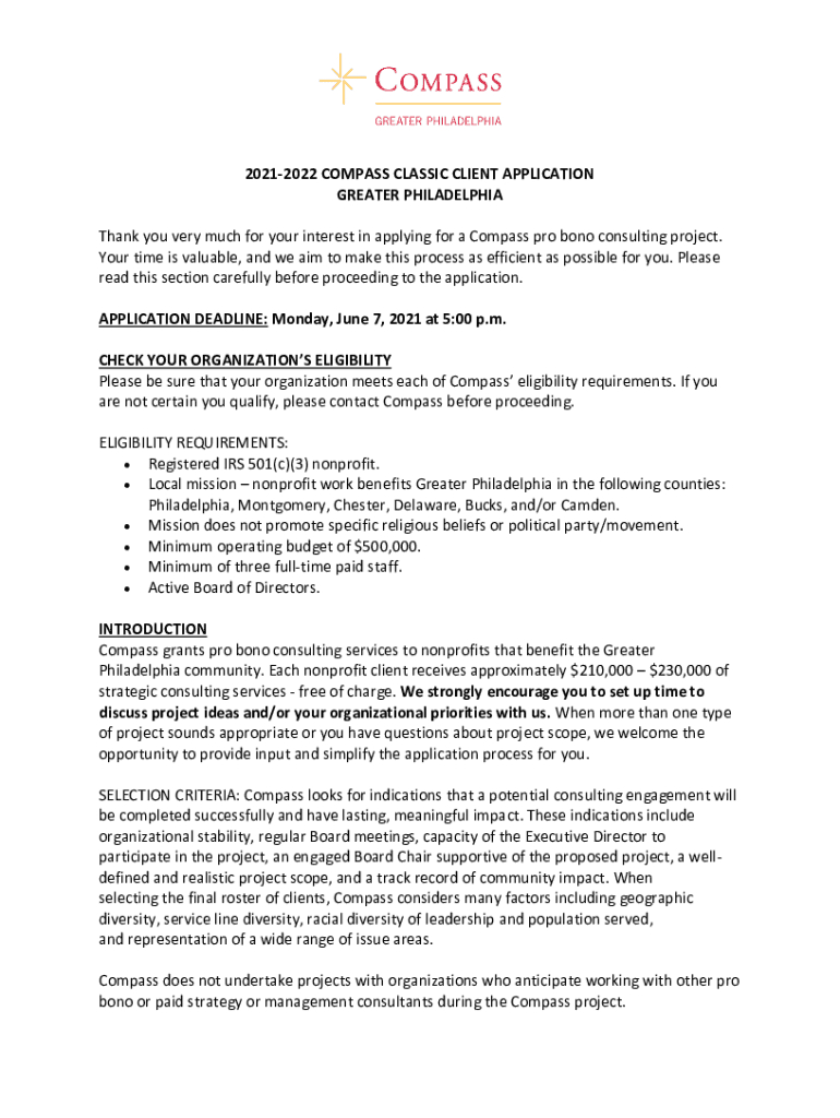20212022 COMPASS CLASSIC CLIENT APPLICATION GREATER PHILADELPHIA Thank you very much for your interest in applying for a Compass pro bono consulting project. Your time is valuable, and we aim to make