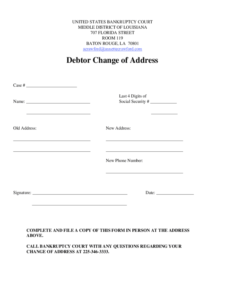 UNITED STATES BANKRUPTCY COURT MIDDLE DISTRICT OF LOUISIANA 707 FLORIDA STREET ROOM 119 BATON ROUGE, LA 70801 acrawford@annettecrawford.comDebtor Change of Address Case # ___Name: ___Last 4 Digits