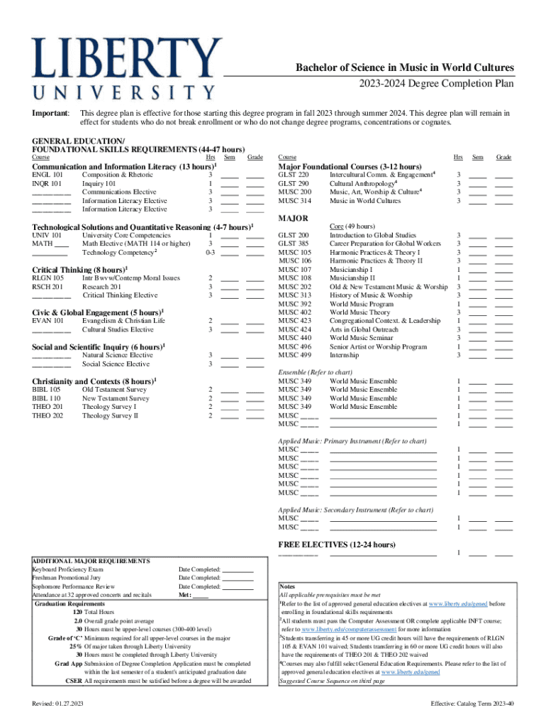 Bachelor of Science in Music in World Cultures 20232024 Degree Completion Plan Important:This degree plan is effective for those starting this degree program in fall 2023 through summer 2024. This