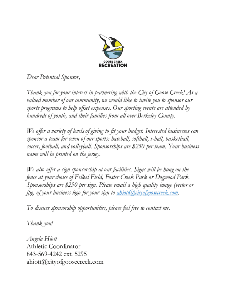 Dear Potential Sponsor, Thank you for your interest in partnering with the City of Goose Creek! As a valued member of our community, we would like to invite you to sponsor our sports programs to help