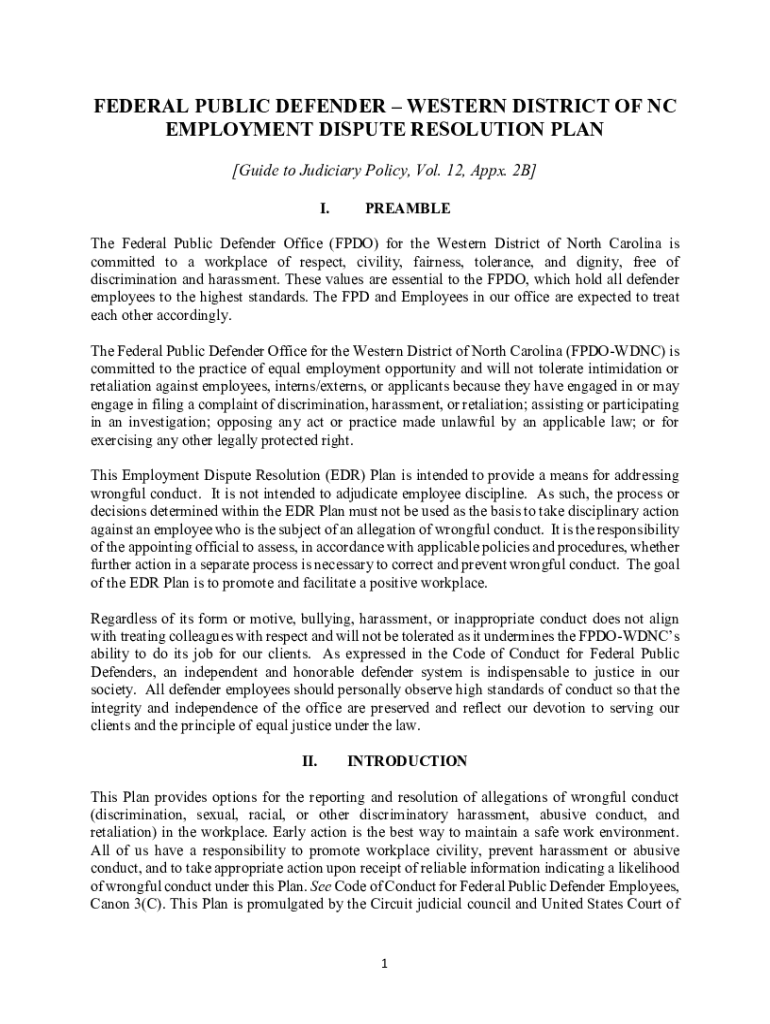 FEDERAL PUBLIC DEFENDER WESTERN DISTRICT OF NC EMPLOYMENT DISPUTE RESOLUTION PLAN [Guide to Judiciary Policy, Vol. 12, Apex. 2B] I. Preamble Federal Public Defender Office (FPO) for the Western District