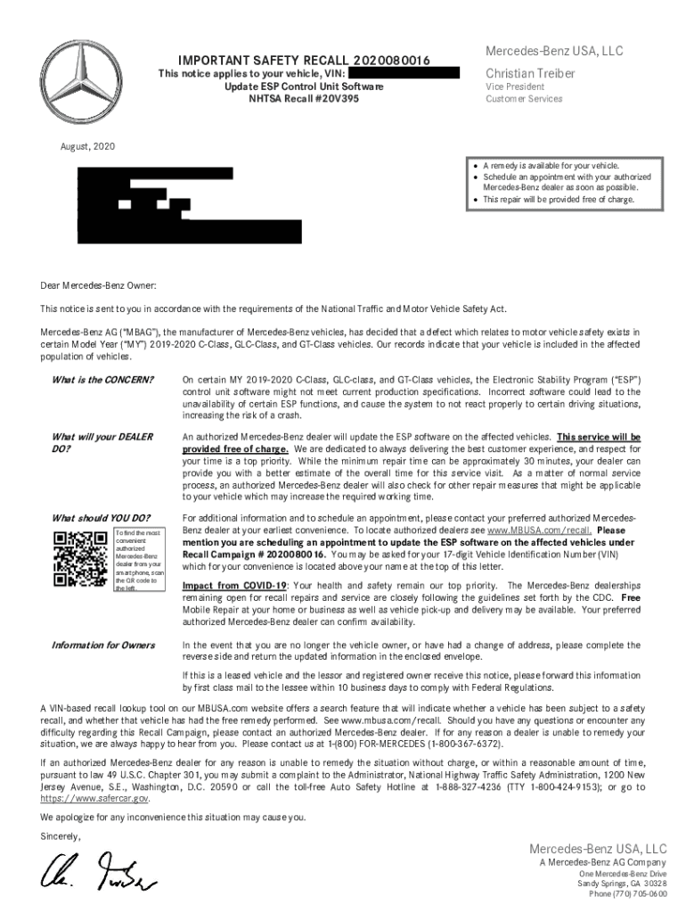 IMPORTANT 2020080016 IMPORTANT SAFETY RECALL 2020080016This notice applies to your vehicle, VIN:V This notice applies to your vehicle, Update ESP Control Unit Update ESP Control Unit Software NHTSA