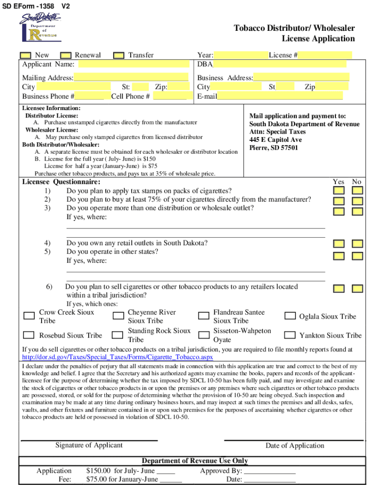 SDE Form 1358V2HELPComplete and use the button at the end to print for mailing. Tobacco Distributor/ Wholesaler License Application New Renewal Transfer Applicant Name: ___Year: License #__ DBA___Mailing