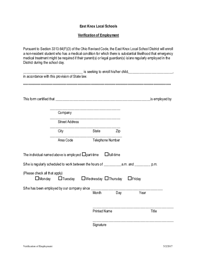 East Knox Local Schools Verification of Employment Pursuant to Section 3313.64(F)(3) of the Ohio Revised Code, the East Knox Local School District will enroll a nonresident student who has a medical