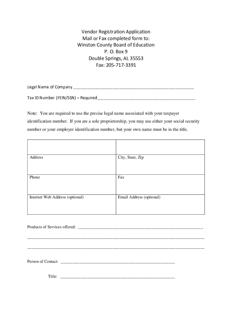 Vendor Registration Application Mail or Fax completed form to: Winston County Board of Education P. O. Box 9 Double Springs, AL 35553 Fax: 2057173391Legal Name of Company ___ Tax ID Number (VEIN/SSN)