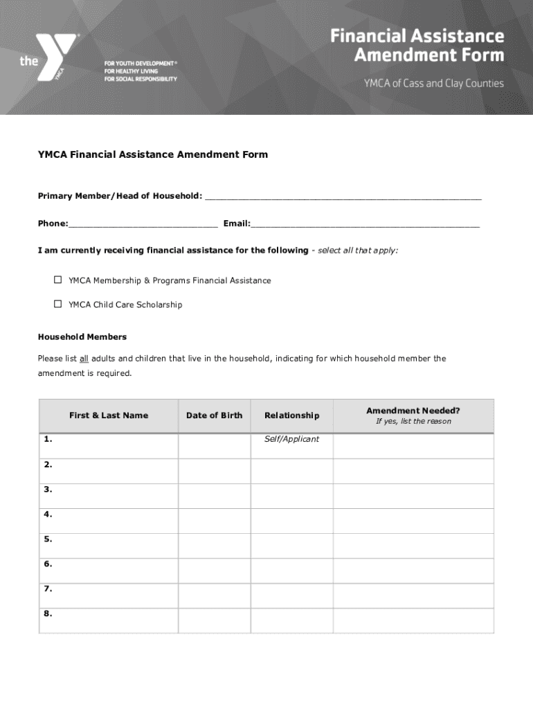 If your household size, dependencies, income, or needs change at any time while receiving YMCA Financial Assistance, you must complete a Financial Assistance Amendment Form. Please only submit an