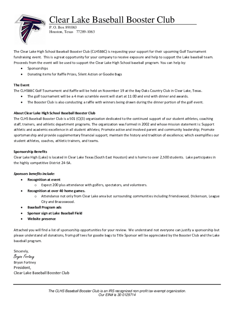 Clear Lake Baseball Booster Club P. O. Box 891063 Houston, Texas 772891063The Clear Lake High School Baseball Booster Club (CLASSIC) is requesting your support for their upcoming Golf Tournament fundraising