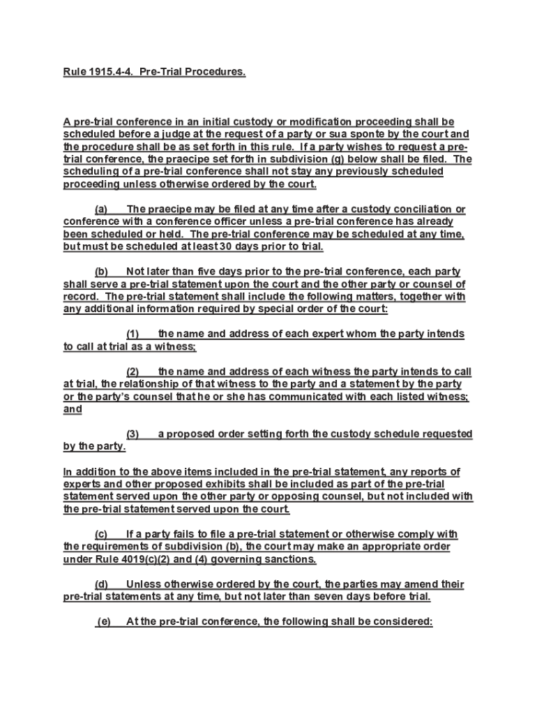Rule 1915.44. Pretrial Procedures. A pretrial conference in an initial custody or modification proceeding shall be scheduled before a judge at the request of a party or SUA sponge by the court and