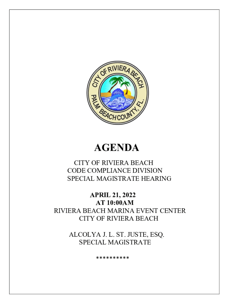 AGENDA CITY OF RIVIERA BEACH CODE COMPLIANCE DIVISION SPECIAL MAGISTRATE HEARING APRIL 21, 2022, AT 10:00AM RIVIERA BEACH MARINA EVENT CENTER CITY OF RIVIERA BEACH ALCOA J. L. ST. JUST, ESQ. SPECIAL