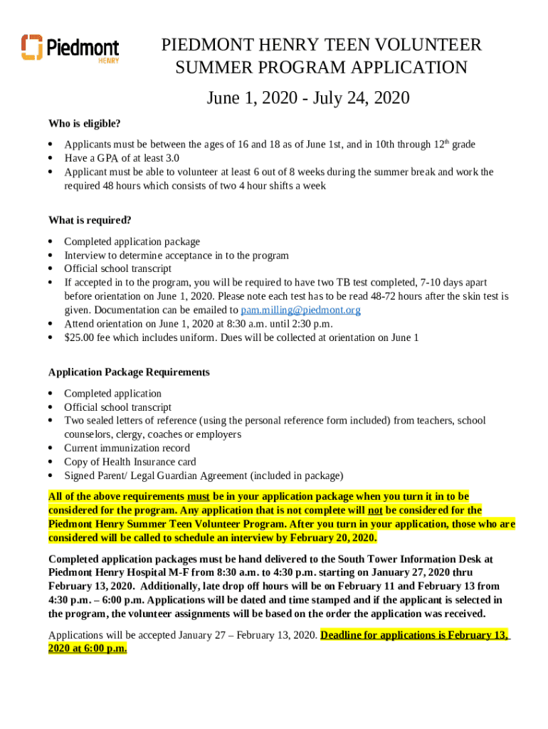 Instructions for the PIEDMONT HENRY TEEN VOLUNTEER SUMMER PROGRAM APPLICATION - schoolwires henry k12 ga form