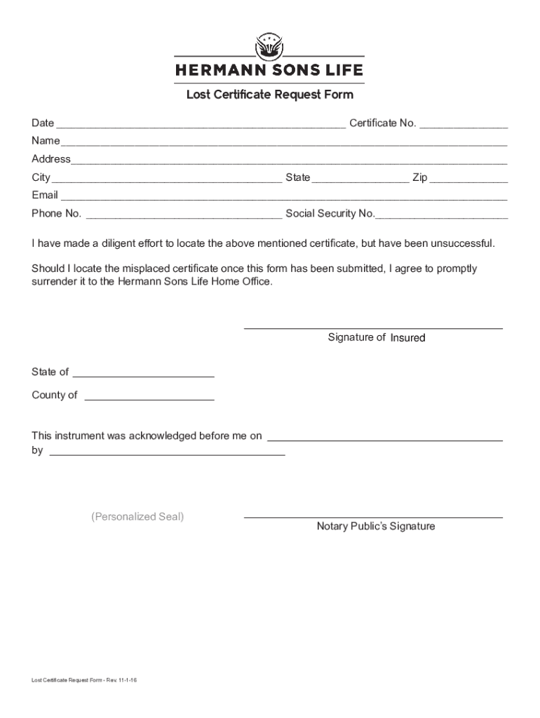 Lost Certificate Request Form Date ___ Certificate No. ___ Name ___ Address ___ City ___ State ___ Zip ___ Email ___ Phone No. ___ Social Security No.___ I have made a diligent effort to locate the