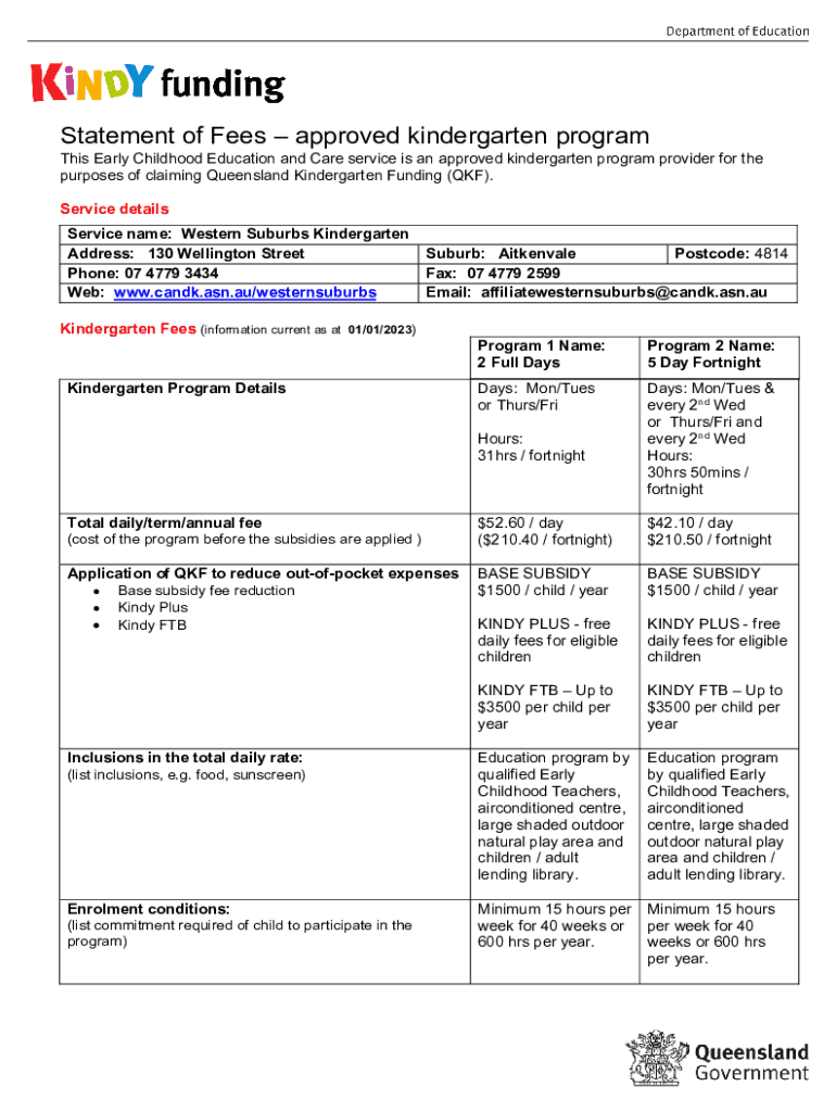Statement of Fees approved kindergarten programs Early Childhood Education and Care service is an approved kindergarten program provider for the purposes of claiming Queensland Kindergarten Funding