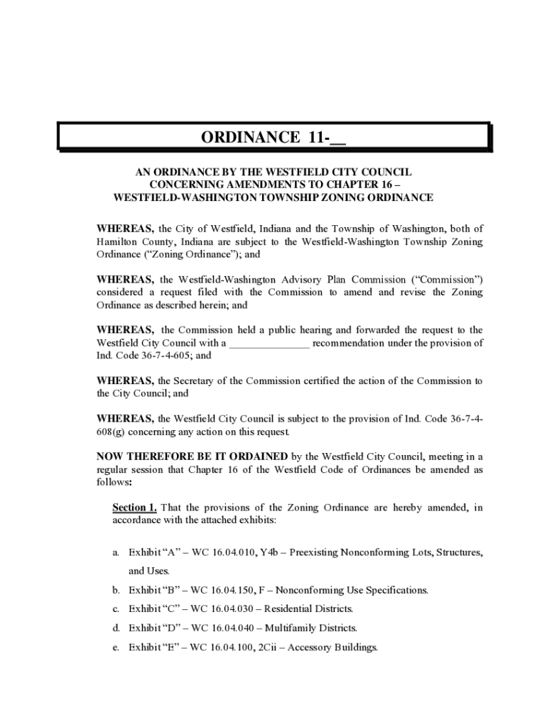 ORDINANCE 11__ AN ORDINANCE BY THE WESTFIELD CITY COUNCIL CONCERNING AMENDMENTS TO CHAPTER 16 WESTFIELDWASHINGTON TOWNSHIP ZONING ORDINANCE WHEREAS, the City of Westfield, Indiana and the Township