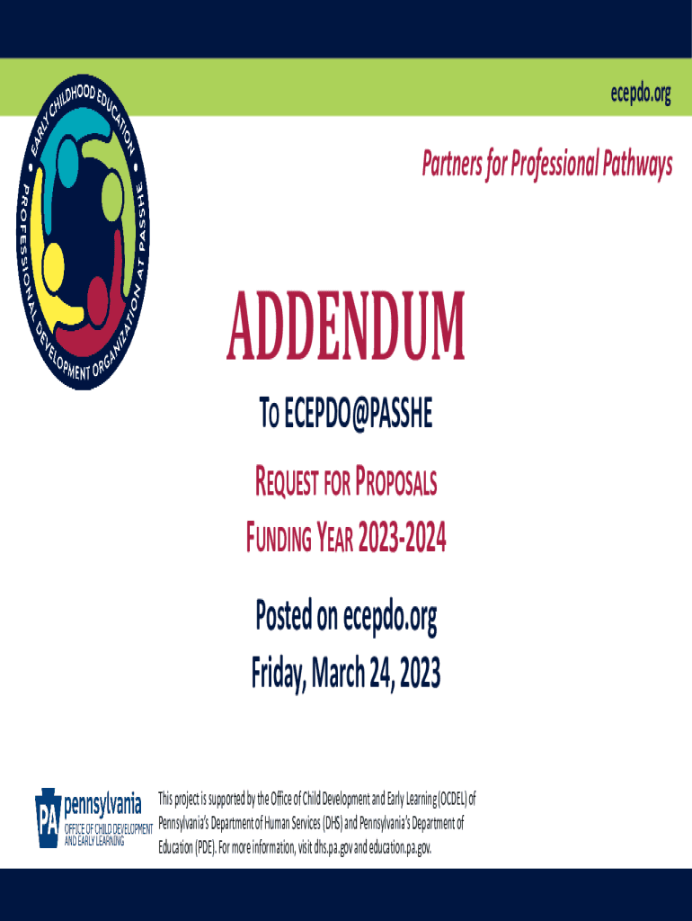 Except.partners for Professional PathwaysADDENDUM TO ECEPDO@PASSHE REQUEST FOR PROPOSALS FUNDING YEAR 20232024 Posted on except.org Friday, March 24, 2023, This project is supported by the Office