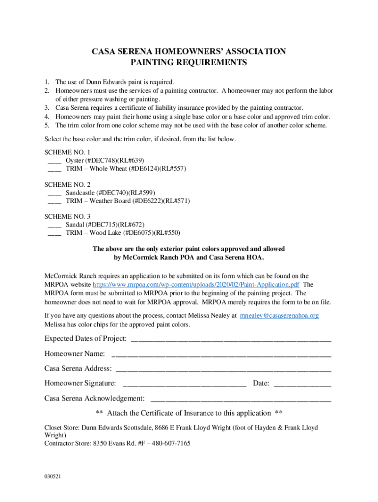 CASA SERENA HOMEOWNERS ASSOCIATION PAINTING REQUIREMENTS 1. The use of Dunn Edwards paint is required. 2. Homeowners must use the services of a painting contractor. A homeowner may not perform the