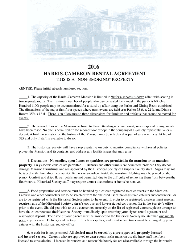 2016 HARRISCAMERON RENTAL AGREEMENT THIS IS A NONSMOKING PROPERTY RENTER: Please initial at each numbered section. ___1. The capacity of the Harris Cameron Mansion is limited to 90 for a served sit