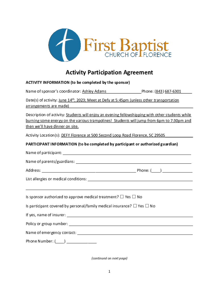 Activity Participation Agreement ACTIVITY INFORMATION (to be completed by the sponsor) Name of sponsors coordinator: Ashley Gramophone: (843) 6876301___Date(s) of activity: June 14th, 2023; Meet at