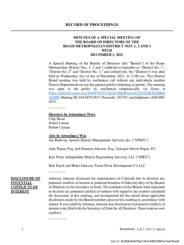 RECORD OF PROCEEDINGS MINUTES OF A SPECIAL MEETING OF THE BOARD OF DIRECTORS OF THE ROAM METROPOLITAN DISTRICT NOS. 1, 2 AND 3 HELD DECEMBER 1, 2021, A Special Meeting of the Boards of Directors (the