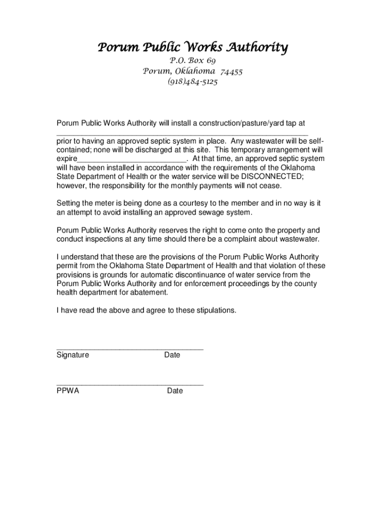 Forum Public Works Authority P.O. Box 69 Forum, Oklahoma 74455 (918)4845125Porum Public Works Authority will install a construction/pasture/yard tap at ___ prior to having an approved septic system