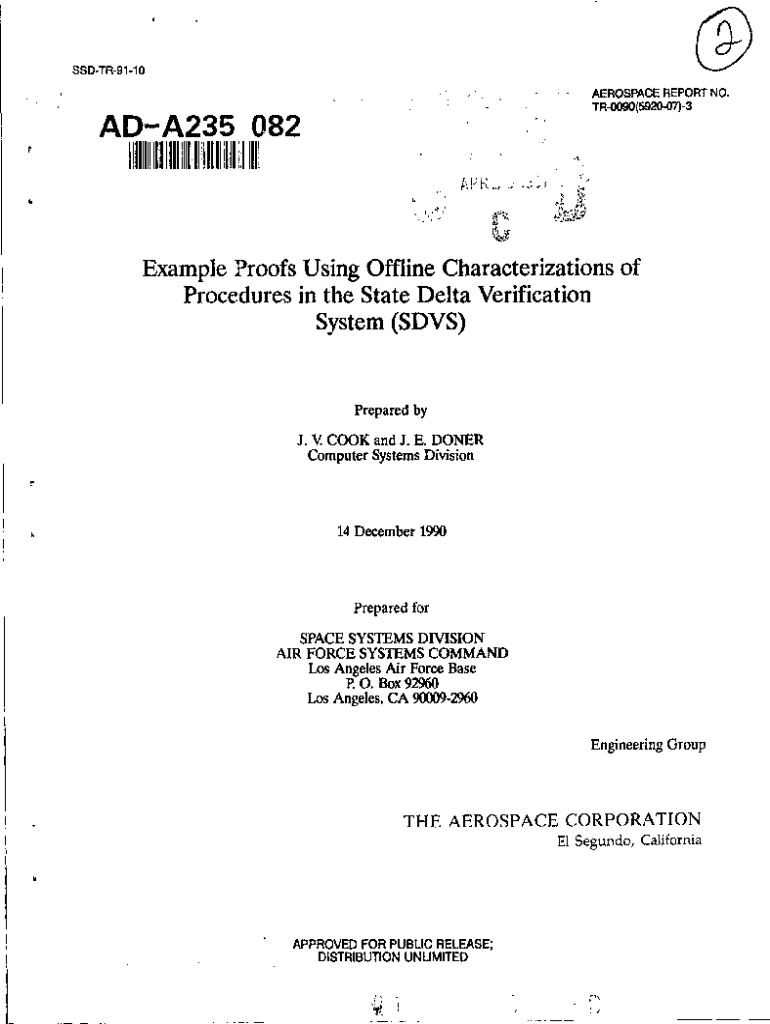 SSDTR9110AEROSPACE REPORT NO. TR0090(592007)3ADA235 082Example Proofs Using Offline Characterizations of Procedures in the State Delta Verification System (DVS)Prepared by J. V. COOK and J. E. DONE