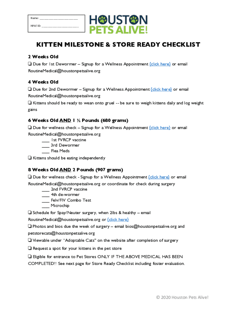 Name: ___ HPA! ID: ___KITTEN MILESTONE & STORE READY CHECKLIST 2 Weeks Old ! Due for 1st Reformer Sign up for a Wellness Appointment click here or email RoutineMedical@houstonpetsalive.org 4 Weeks