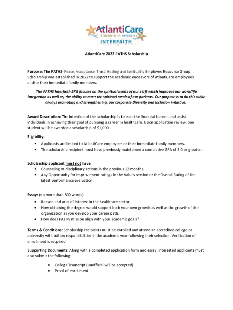 Atlantic 2022 PATHS ScholarshipPurpose: The PATHS Peace, Acceptance, Trust, Healing and Spirituality Employee Resource Group