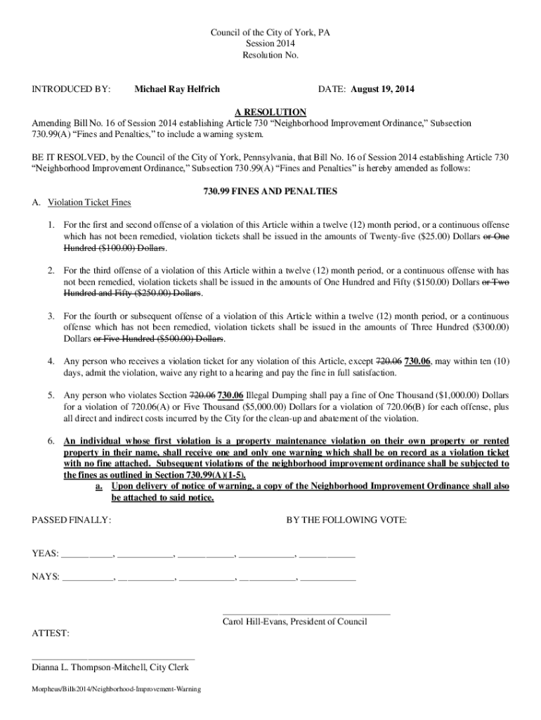 Council of the City of York, PA Session 2014 Resolution No. INTRODUCED BY:Michael Ray HelfrichDATE: August 19, 2014A RESOLUTION Amending Bill No. 16 of Session 2014 establishing Article 730 Neighborhood