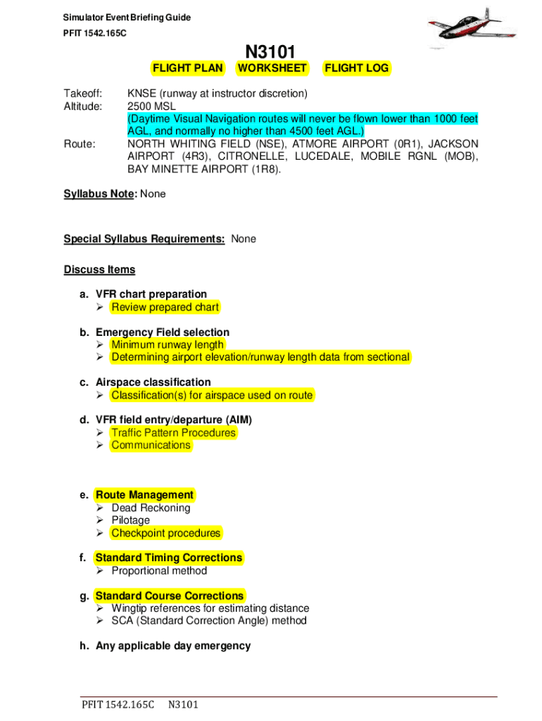 Simulator Event Briefing Guide FIT 1542.165CN3101 FLIGHT PLAN Takeoff: Altitude:Route:WORKSHEETFLIGHT LOGINS (runway at instructor discretion) 2500 SL (Daytime Visual Navigation routes will never