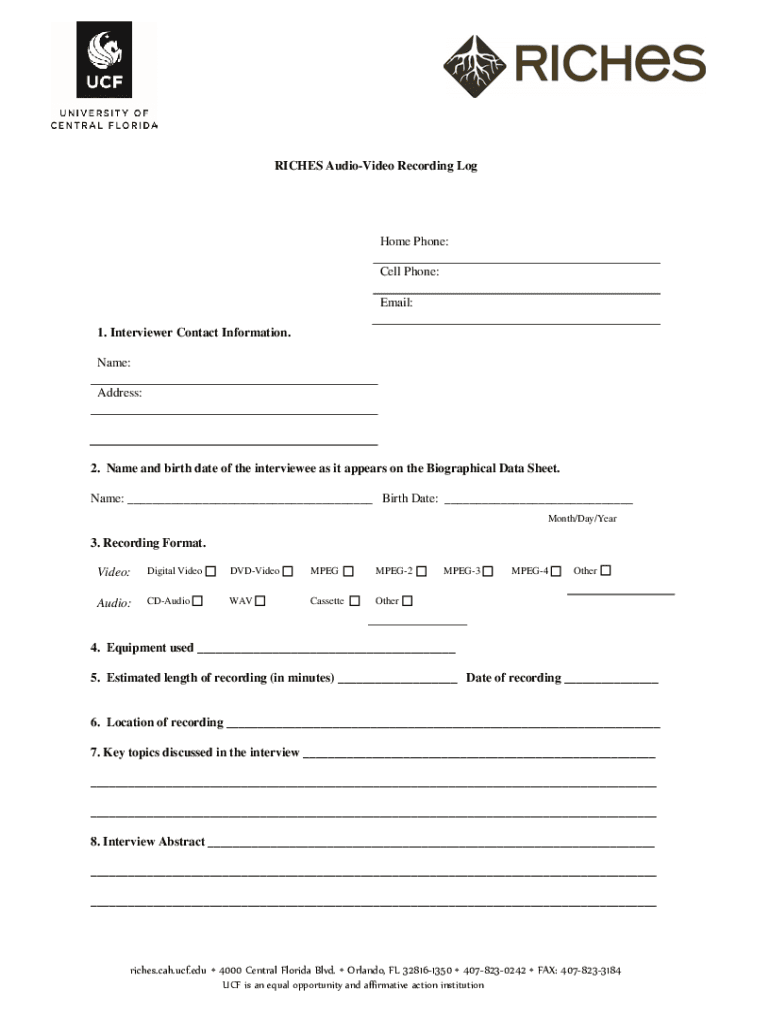 RICHES AudioVideo Recording Lughole Phone: Cell Phone: Email: 1. Interviewer Contact Information. Name: Address:2. Name and birthdate of the interviewee as it appears on the Biographical Data Sheet.