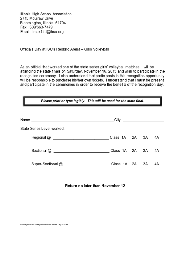 Illinois High School Association 2715 McGraw Drive Bloomington, Illinois 61704 Fax: 309/6637479 Email: lmuxfeld@ihsa.orgOfficials Day at Isis Redbird Arena Girls Volleyballs an official that worked