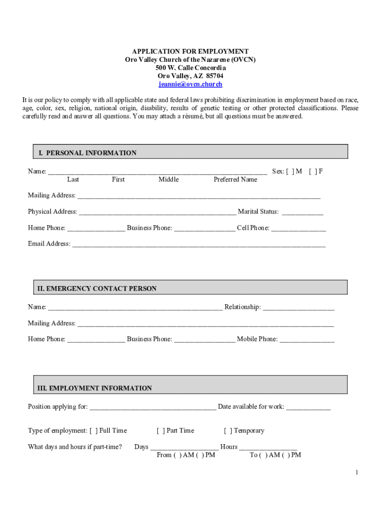 APPLICATION FOR EMPLOYMENT Oro Valley Church of the Nazarene (OVEN) 500 W. Called Concordia Oro Valley, AZ 85704 jeannie@ovcn.church It is our policy to comply with all applicable state and federal