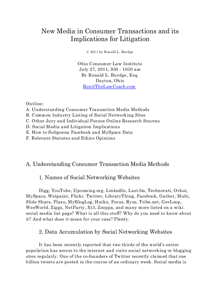 New Media in Consumer Transactions and its Implications for Litigation 2011 by Ronald L. BurdgeOhio Consumer Law Institute July 27, 2011, 930 1030 am By Ronald L. Budge, Esq. Dayton, Ohio Ron@TheLawCoach.comOutline: